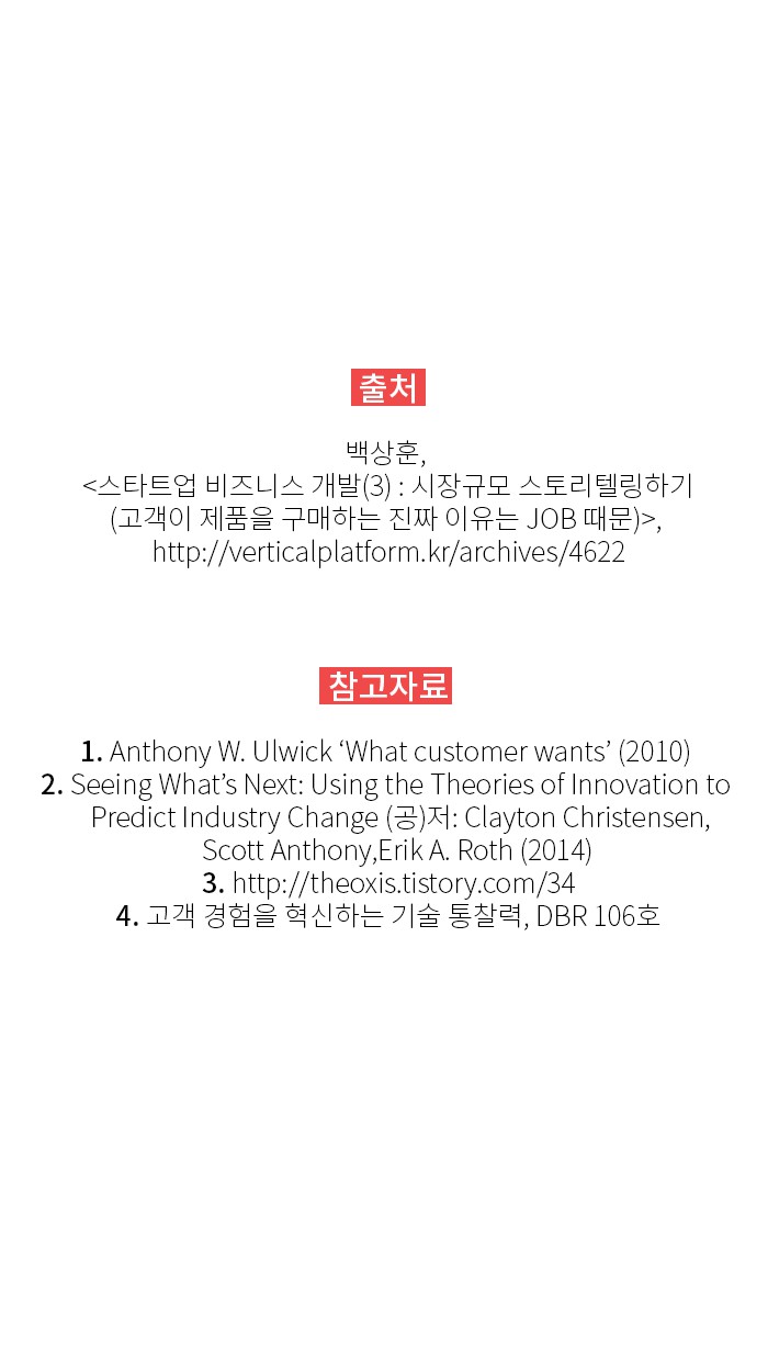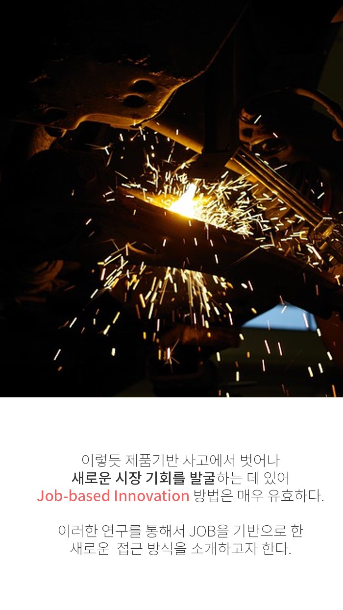 따라서 단순히 제품의 변형, 사양 변화에 집중하는 것이 아니라, 제품을 사용하는 소비자를 입체적으로 관찰하여 JOB을 파악하고, 그 JOB을 해결한다면 새로운 시장을 개척할 수 있습니다.