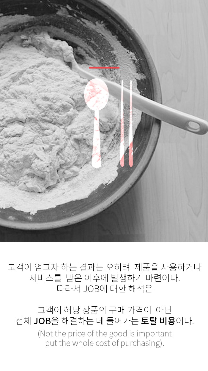 즉, 고객들은 그들이 해결해야할 작업수행과 목적(홀)을 달성하기 위해 제품과 서비스(드릴)를 구매하는 것이라는 점입니다. 그래서 고객의 구매동기를 이해하려면 JOB을 해결하는 것에서부터 출발해야 한다고 주장합니다.