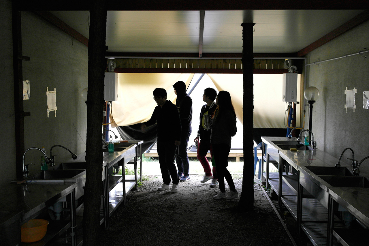 오후 5시 30분, 이제 슬슬 밥 준비를 할 시간이 됐습니다. (흐뭇) 팀원들은 채소와 조리 도구를 씻으러 개수대로 향했습니다.