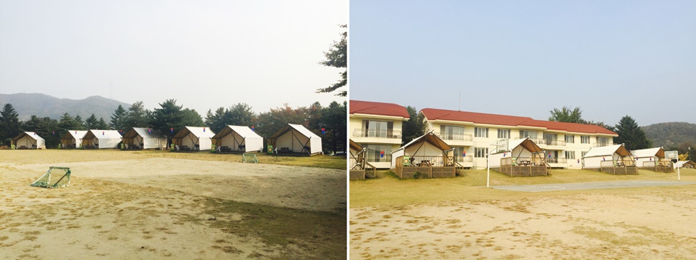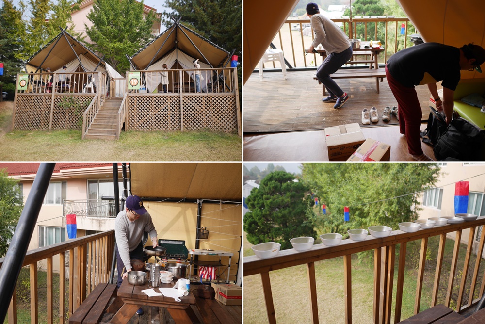 포스타입 팀은 남자 셋, 여자 둘로 구성되어 있어서 쌍둥이 텐트 두 개가 한 세트인 곳을 지정 받았는데, 이 쌍둥이 텐트는 다른 텐트보다 ‘특별히’ 주변 경치가 좋아서 정말 맘에 들었습니다. 아름답게 단풍이 든 은행나무를 보니 가을이라는 게 물씬 느껴지더라고요.