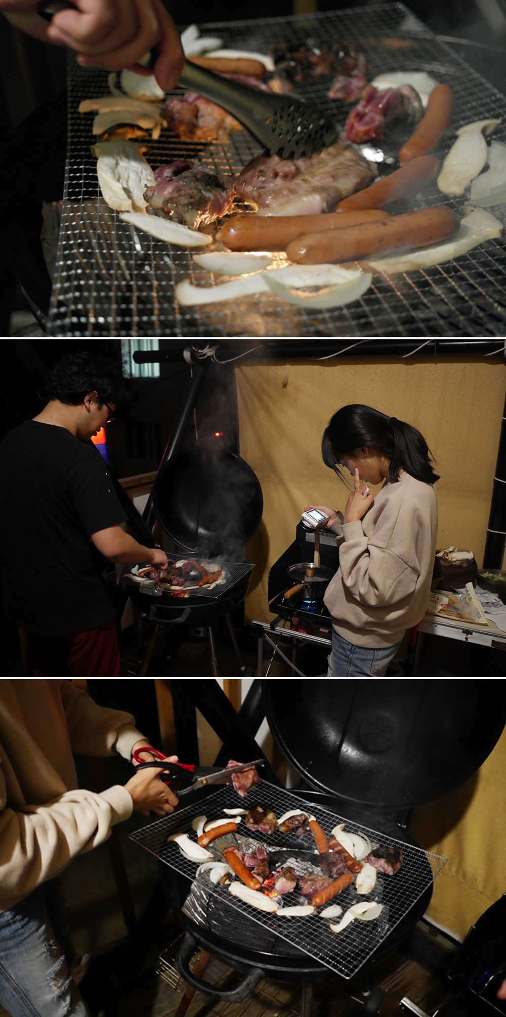 이렇게 저녁 식사를 준비하는 사이, 해가 저물었습니다. 저녁 메뉴는 돼지 목살과 소시지, 그리고 어묵탕이었습니다. 구본욱님과 정신애님은 고기를 맛있게 구워 주셨고, 언제나 찌개 담당인 신규섭 대표님이 어묵탕을 (싱겁게) 끓이는 동안, 현승재님은 옆 텐트로 건너가 즉석밥을 조리해 오셨습니다.