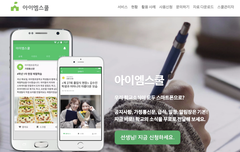 아이엠스쿨은 국내 최대의 모바일 알림장 서비스로, 전국 99%에 이르는 11,500개 학교의 62,983개 게시판의 모바일 알림장을 제공한다. 출시 후 2년만에 130만명이 넘는 사용자를 모으는 성과를 거두었다.