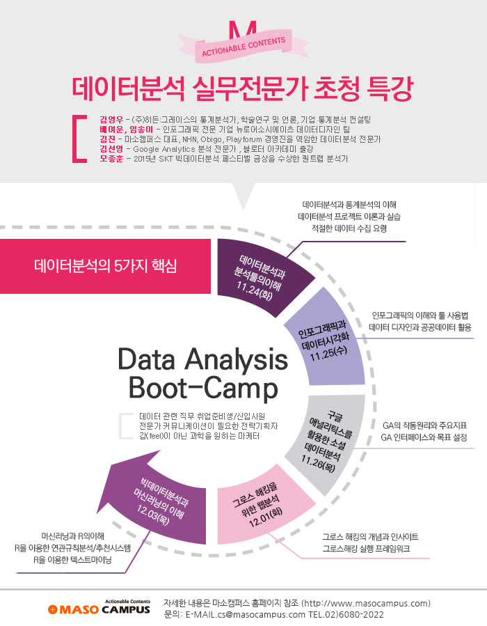이번 데이터분석 부트캠프는 11월 24일 김영우 (주)히든:그레이스의 통계분석가가 진행하는 데이터분석 프로젝트의 수행절차와 데이터 수집의 이해에 관한 특강을 시작으로, 11월 25일에는 인포그래픽 전문기업 뉴로어소시에이츠 데이터디자인팀이 현업에 많이 쓰이는 데이터 디자인과 공공데이터의 활용 요령을 설명한다.