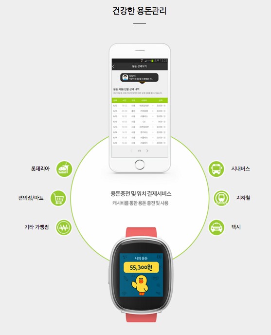 부가적인 기능이겠습니다만 개인적으로 키위워치가 제공하는 기능 중 가장 관심이 가는 것은 캐시비와 연동된 용돈 충전 및 결제 서비스입니다.