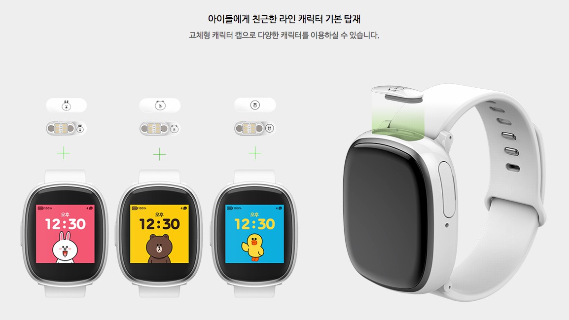 라인과 키위워치의 콜라보레이션은 단순히 캐릭터를 이미지로 활용하는 것에서 조금 더 나아가 약간의 하드웨어적인 재미를 추가해 두었습니다. 제품의 상단에 “캐릭터 캡”을 꽂을 수 있는 슬롯이 있고 여기에 어떤 캐릭터 캡을 꽂았느냐에 따라 단말에서 캐릭터와 테마를 바꿔주는 방식입니다.