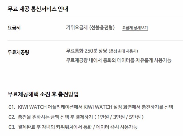 키위워치는 SK텔레콤의 준과 마찬가지로 전용 요금제가 제공됩니다. SK텔레콤과 차이가 있다면 선불형 요금제로 충전한 만큼 사용하는 방식이라는 점입니다.