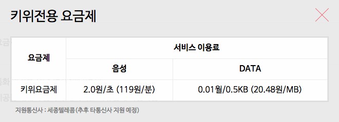 준의 경우에는 월 정액으로 세전 8천원의 요금이 제공되고 있습니다. 참고로 준 요금제는 1) 음성통화 30분 무료, 2) 망내 1회선 무제한 통화, 3) 데이터 100MB 를 제공하고 있습니다. 단순히 키위전용 요금제와 어떤 것이 유리한지 계산하기는 쉽지 않습니다만, 음성통화 30분에 데이터 216MB 정도를 쓰면 8천원 정도가 됩니다. 망내 1회선 무제한이 키위 전용 요금제에는 없다는 점을 고려해야 하겠습니다!