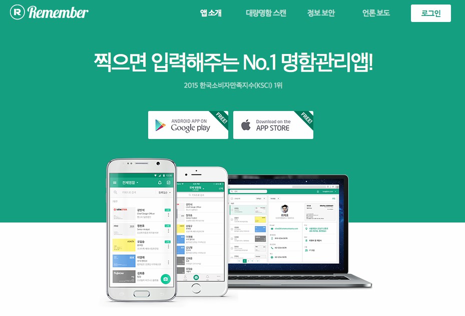 리멤버는 명함을 촬영하여 업로드하면 명함의 정보를 사람이 직접 분석하여 적절한 필드로 분리하여 저장해주는 방식으로 OCR(Optical Character Recognition) 방식에 비해 오류가 적고 패턴화 되어 있지 않은 명함들의 정보도 정확하게 업데이트 해주기 때문에 직장인들이나 사업을 하는 사람들에게 무척 인기가 많은 서비스입니다.
