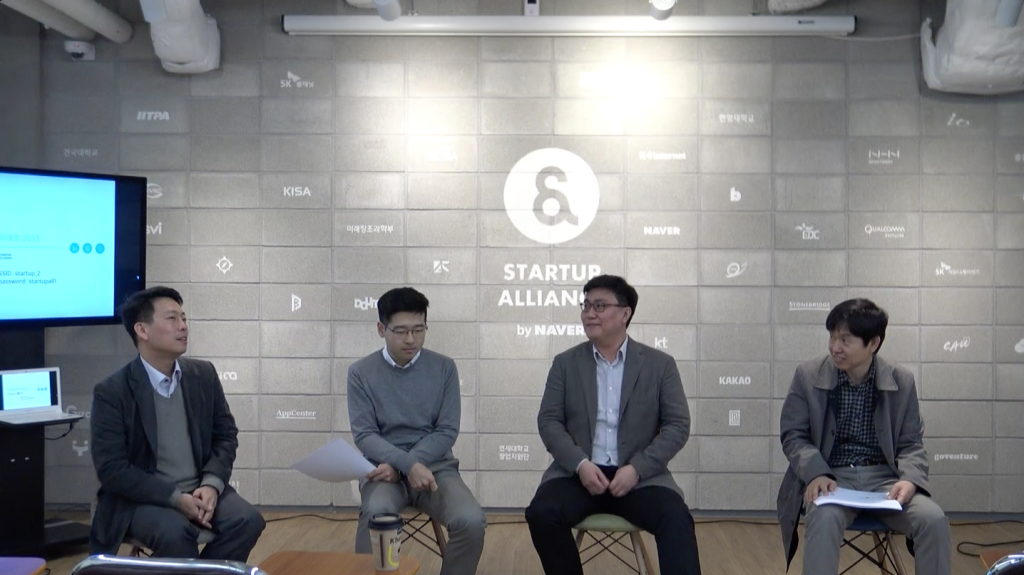 리포트 결과 발표 후 패널 토론 장면. (왼쪽부터) 임정욱 스타트업 얼라이언스 센터장, 김동호 IDINCU 대표, 이택경 매쉬업엔젤스 대표, 이동형 나우프로필 대표