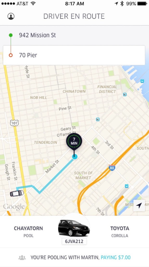 지난 9월 컨퍼런스참석차 샌프란시스코에 갔을 때의 일이다. 시내에서 외곽에 있는 컨퍼런스행사장에 가는데 우버앱을 실행하니 우버풀(UberPool)이라는 새 서비스가 나왔다. 우버를 이용한 일종의 합승인데 샌프란시스코시내에서는 어디나 7불이면 갈 수 있다. 대신 같은 방향으로 가는 다른 1명의 손님과 동승해야 한다. (같은 방향으로 가는 승객이 없으면 혼자서 가도 되고 그래도 7불만 내면 된다.)
