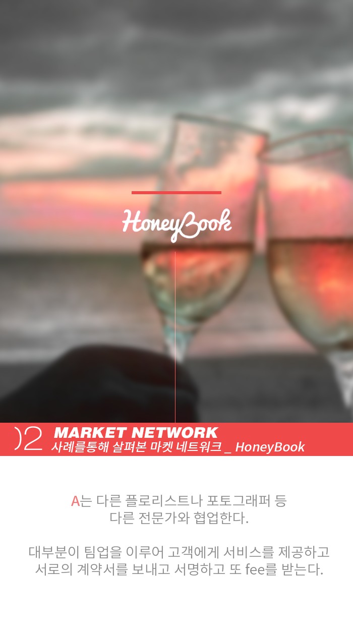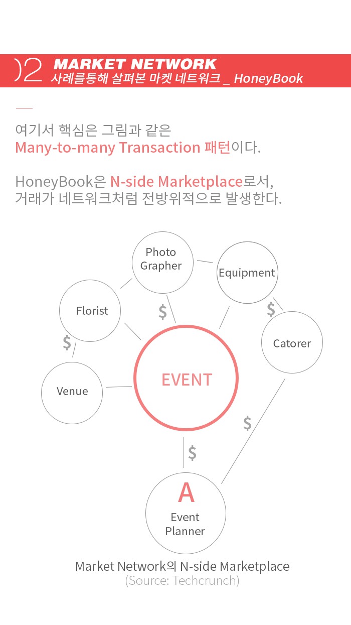 2. 사례를 통해 마켓 네트워크를 좀 더 쉽게 살펴보죠. Honeybook.com이라는 서비스가 미국에서는 최근 인기가 있는데요, 이 서비스는 이벤트를 열고자 하는 기업 또는 단체와 이벤트 플래너/플로리스트/포토그래퍼 등 다양한 전문가를 연결해주는 서비스로 이벤트 산업의 마켓네트워크를 표방하고 있습니다.