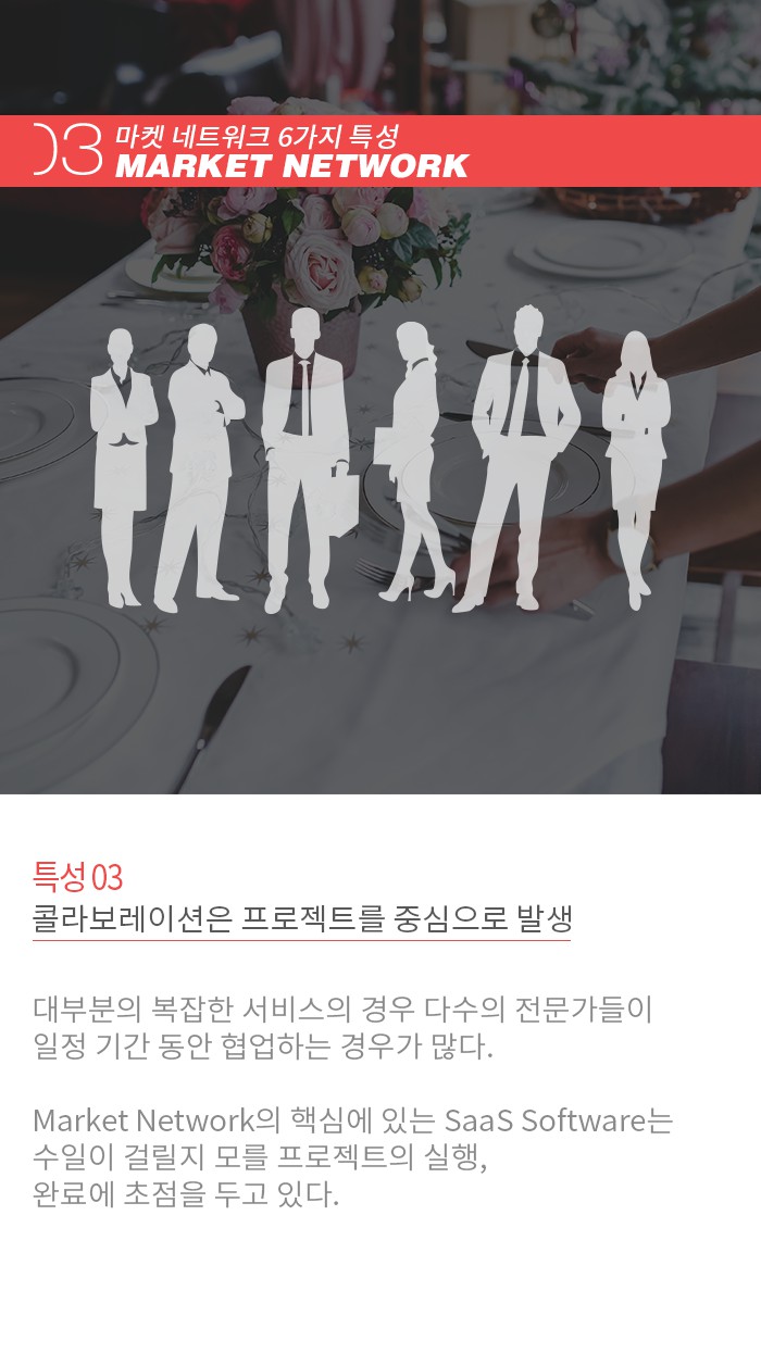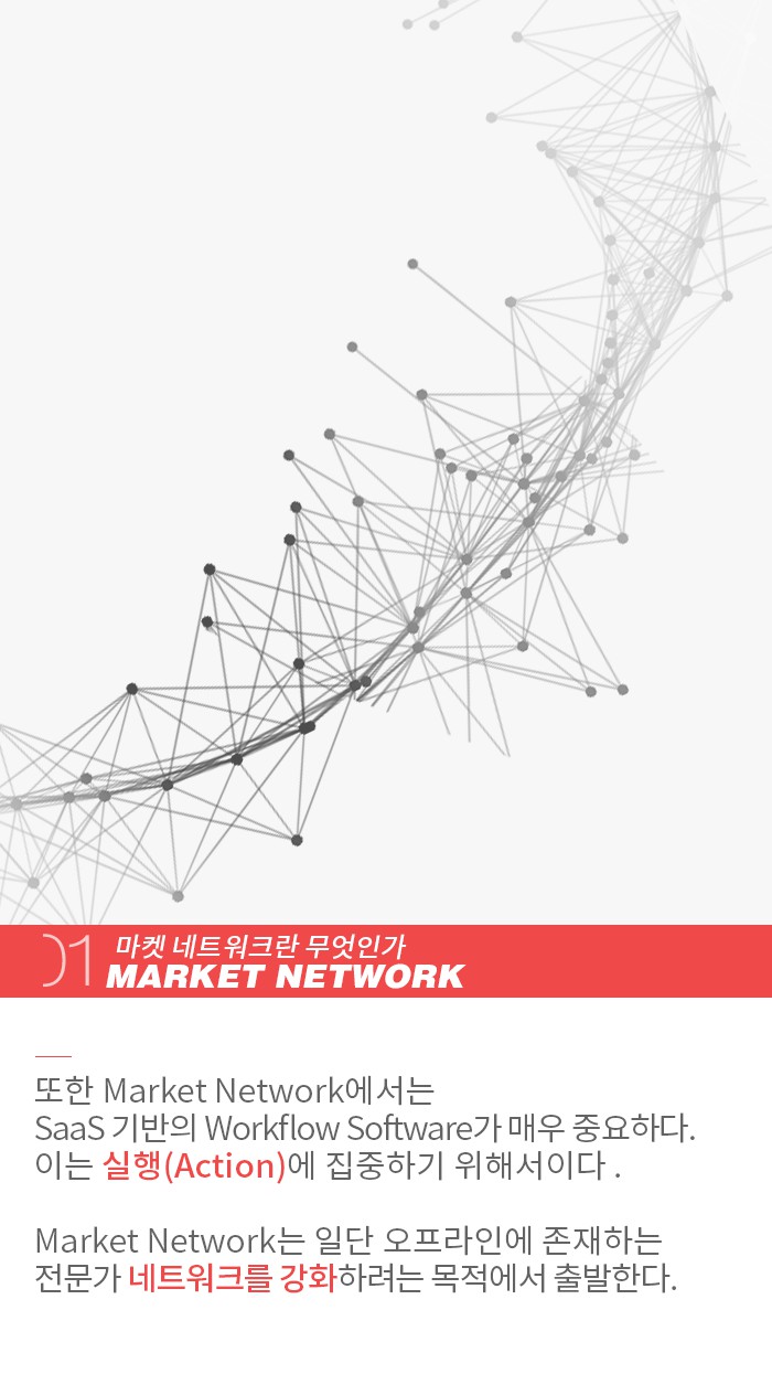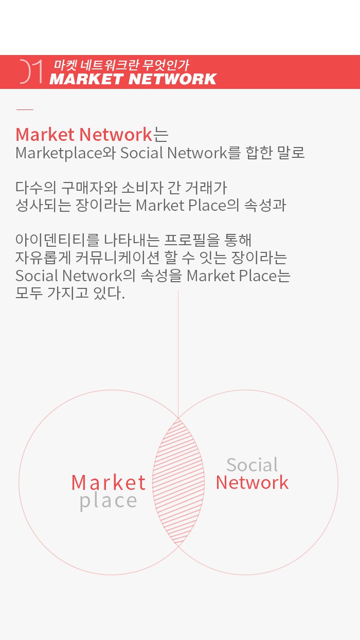 1. “Market Network”는 “Marketplace”와 “Social Network”를 합한 말로, Marketplace는 다수의 구매자와 소비자 간 거래가 성사되는 장을 의미하고, Social Network는 아이덴티티(Identity)를 나타내는 프로필을 제공한 뒤 자유롭게 커뮤니케이션할 수 있는 장을 의미합니다(ex. Facebook, Twitter, LinkedIn 등). Market Network에는 이 두 가지의 속성이 모두 포함되어 있기 때문에 붙여진 용어입니다.