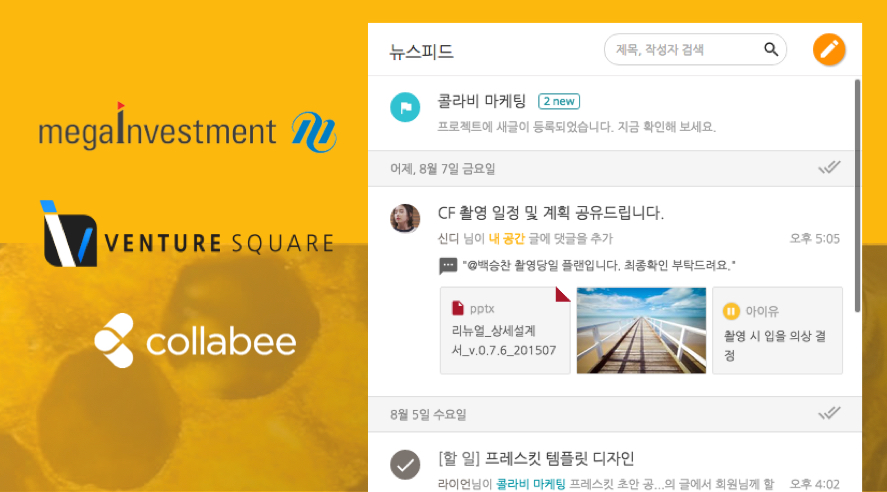 업무시간을 반으로 줄여주는 협업툴, ‘콜라비’를 만드는 스타트업 (주)콜라비팀이 메가인베스트먼트, 벤처스퀘어로부터 Pre-Series A 투자를 유치했다고 밝혔다. 올해 5월 매쉬업엔젤스로 부터 시드머니를 투자 받은 이후 2번째 투자이다.