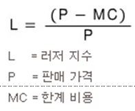 기존 경제이론의 시장구조에서 완전경쟁시장은 한계비용(MC : Marginal Cost, 상품 1단위를 추가로 생산하기 위해 필요한 비용으로서 생산을 위해 필요한 자원의 크기를 반영)과 시장가격(Price)가 같다. 즉, 시장이 완전경쟁시장이라면, MC (한계비용)= P(시장가격)이 같은 지점에서 생산량(Q)이 결정되며, 러너지수 공식에서 분자가 ’0′이 되어 러너지수는 0이 산출된다.