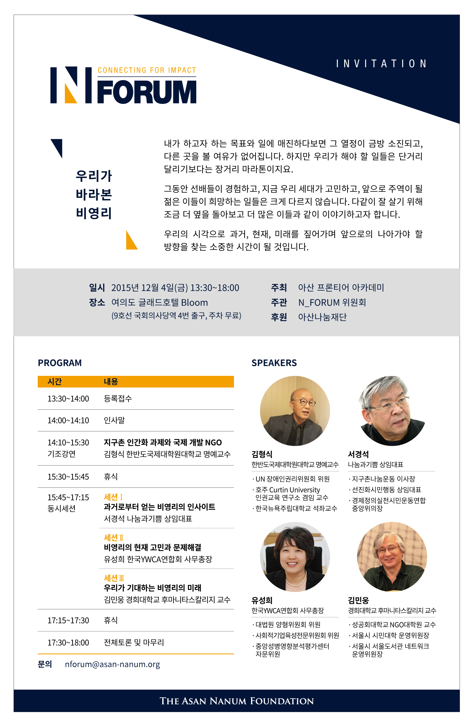 N 포럼은 비영리기관 종사자들을 중심으로 비영리 분야의 현황을 진단하고 발전 방안을 논의하는 자리로아산나눔재단은 비영리기관 종사자 역량 강화를 위해 2012년부터 아산 프론티어 아카데미를 기획하고, 비영리기관 종사자 90여 명을 대상으로 교육을 진행해왔다.
