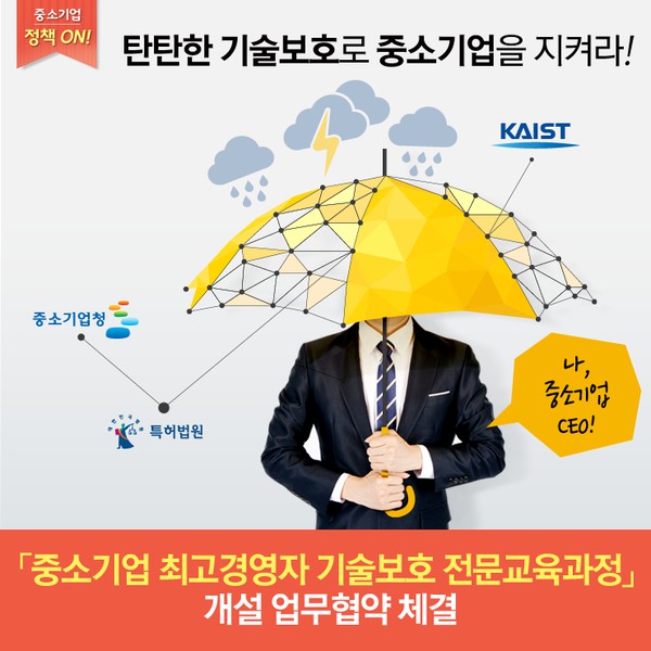중소기업청은 특허법원, KAIST와 중소기업 최고경영자의 기술보호 인식을 높이기 위해 11월 23일 ‘중소기업 최고경영자 기술보호 전문교육과정’ 개설 업무 협약을 체결했습니다.