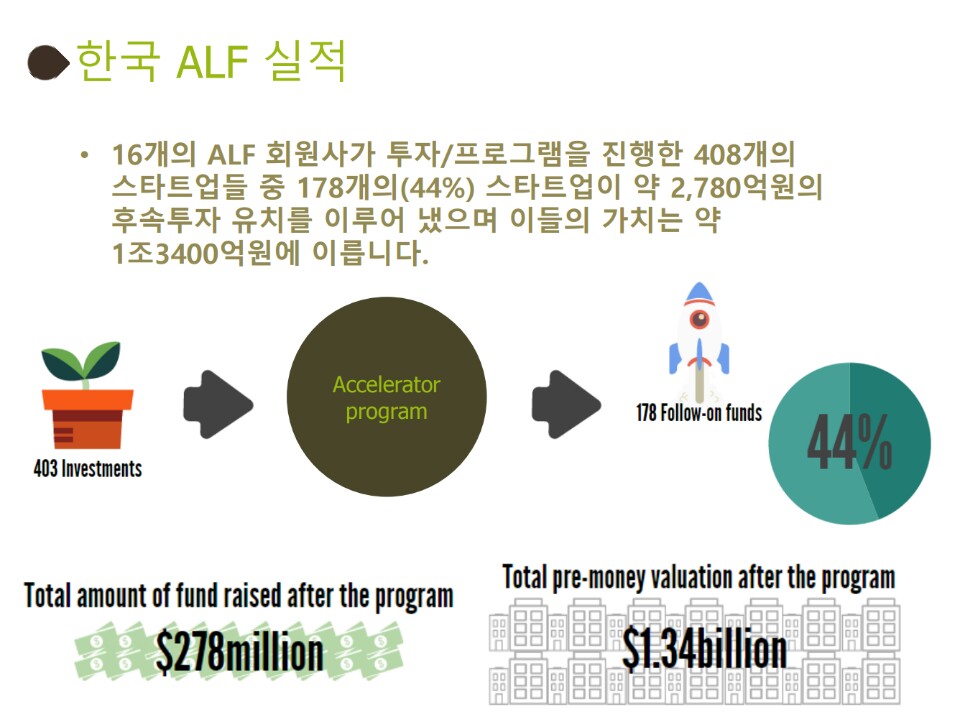 국내 액셀러레이터 연합체인 ALF의 이한주 의장은 환영사에서 ” 대한민국 액셀러레이터가 투자, 프로그램을 진행한 408개의 스타트업들 중 178개의 스타트업이 약 2,780억 원의 후속투자 유치를 이루어 냈으며 이들의 가치가 약 1조3400억 원에 육박한다” 며 “국내 스타트업 생태계가 점점 활성화 되고 있다” 고 말했다.