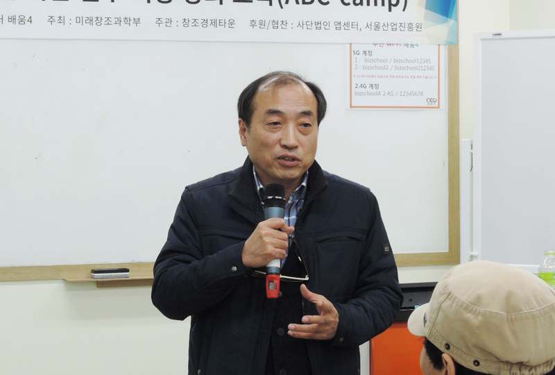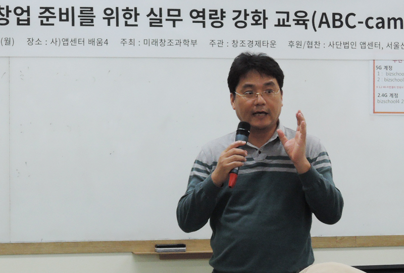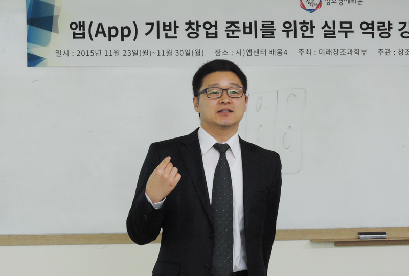 앱센터 김세진 본부장은 “혁신의 기회를 제공하는 네트워킹 허브”라고 앱센터를 소개하면서 창업에 있어 필요한 기초 지식을 이야기하였다. 그는 “창업하려면 축적된 역량으로 개념(Concept)을 설계할 수 있는 능력을 키워야 한다.”고 강조하였다.