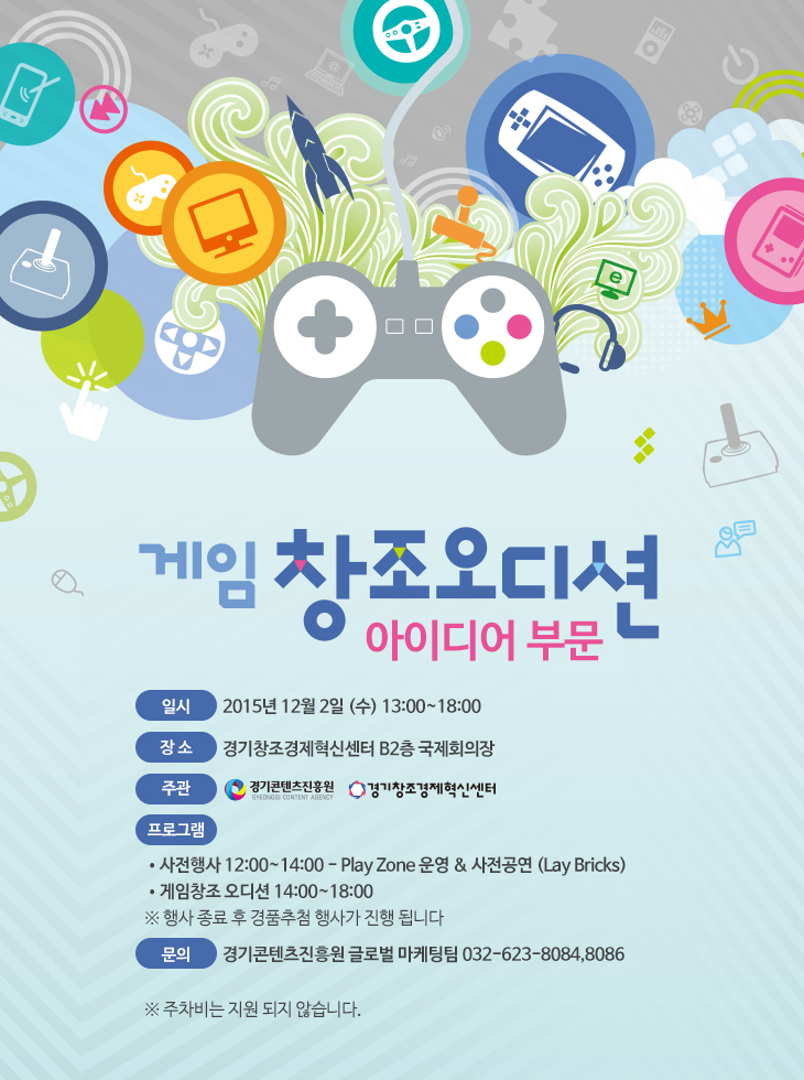아이디어부문 게임 창조 오디션 최종 결선은 오는 12월 2일 오후 1시 경기창조경제혁신센터 국제회의장에서 개최된다.