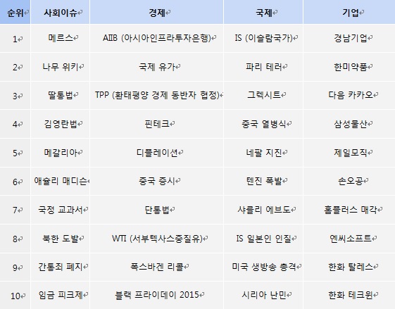 메르스와 나무위키에 이어 전기통신사업법 시행령 개정안을 ‘단통법’에 빗대 만든 신조어 ‘딸통법’이 3위에 올랐고, 올해 3월 통과된 ‘김영란법’도 4위로 많은 관심을 받았다. 5위는 일베의 여성혐오에 반발해 만들어진 여성 온라인 커뮤니티 ‘메갈리아’가 차지했다.