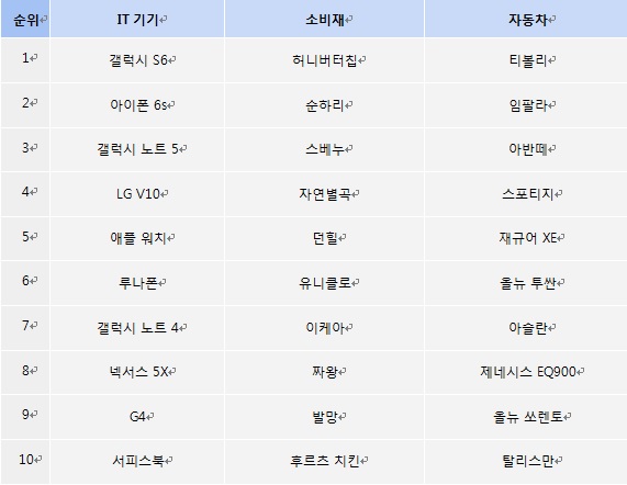 IT기기 중에서는 4월 출시된 ‘갤럭시 S6’가 검색 사용자들 사이에서 가장 화제가 되었다. 합리적인 가격의 가성비 제품으로 인기를 끈 ‘루나폰’과 ‘넥서스 5X’도 10위 안에 이름을 올렸다. ‘애플 워치’는 5위를 차지하며 웨어러블 기기 중 유일하게 이름을 올렸다.