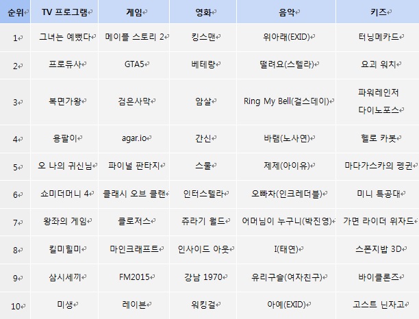 게임 중에서는 올해 7월 새롭게 출시해 큰 화제를 모은 ‘메이플 스토리 2’가 1위를 차지했다. ‘클래시 오브 클랜’, ‘레이븐’ 등 모바일 게임도 각각 6위, 10위를 차지했다.