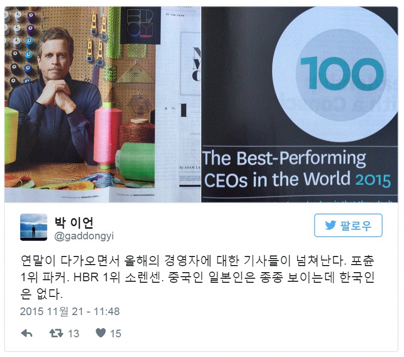 위 트윗을 보고 한번 찾아봤다. 아시아기업의 경영자로는 포춘의 2015 Top People In Business 리스트에는 7위에 샤오미 레이 준, 14위에 대만 TSMC의 모리스 장, 18위 중국 핑안 회장 마밍츠, 25위 알리바바 마윈 27위 텐센트 마화텅이 들어가 있다. 하버드비즈니스리뷰의 가장 높은 성과를 올린 CEO 100위를 대충 살펴보니 10위에 Canon 미타라이 CEO, 33위 대만 폭스콘 테리 궈, 35위 유니클로 타다시회장, 45위 텐센트 마화텅, 78위에 소프트뱅크 손정의회장이 랭크되어 있다. 한국 경영자는 한명도 없다. 예전에는 삼성전자 윤종용부회장이라도 순위에 있고는 했는데…
