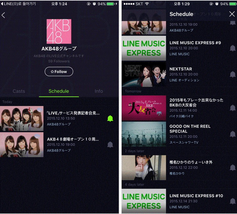 네이버의 브이의 경우 아기자기한 분위기의 앱이지만 라인 라이브의 경우 어떻게 보면 다소 딱딱하면서도 오피셜한 느낌의 앱 분위기를 연출하고 있습니다. 처음 타겟하는 시장이 한국과 일본으로 나뉘어졌기 때문에 각 국가에서 더 어필할 수 있는 접근을 하고 있다는 생각이 듭니다. 좋아하는 셀럽의 일정을 확인하고 업데이트를 팔로우 하는 것등은 두 서비스에서 공히 제공하는 공통적인 기능입니다.