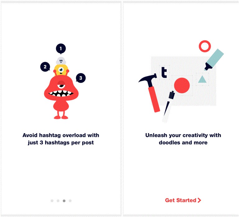 테일은 해시테그 기반으로 움직이지만 각 해시테그에 등록된 컨텐츠는 사진, 영상 뿐만 아니라 짧은 글을 포스팅 하기에도 부담이 없고 업데이트한 이미지에 간단한 문장이나 그림을 그려 넣을 수 있어 조금 더 재미있는 커뮤니케이션이 가능합니다. 라인 계정을 이용하여 서비스 등록을 하고 나면 간단한 튜토리얼을 통해 기능을 소개받을 수 있고 바로 이용이 가능합니다. 아직 초도 버전 상태이기 때문에 앱에 자잘한 버그들도 많이 보이고 서비스에 대한 몰입도가 높은 편은 아닙니다.