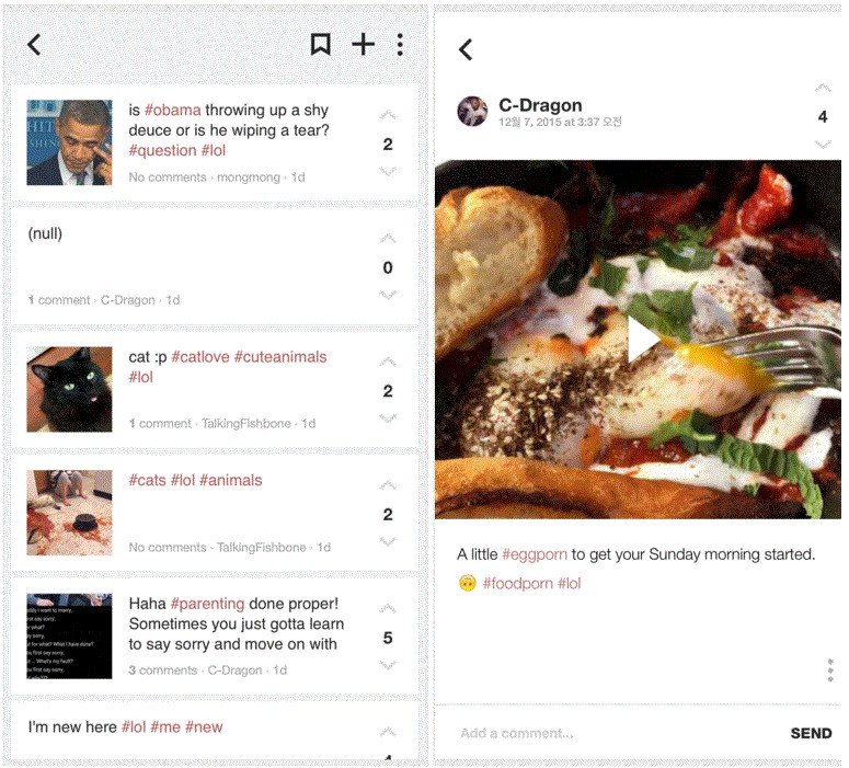 블로그 포스팅을 쓰듯 타이틀을 지정하고 2~3가지 해시태그를 지정하면 해당 해시태그별로 자동으로 분류되어 컨텐츠가 등록이 됩니다. 사진, 글, 영상 등을 입맛에 맞게 올리고 편집한 다음 업데이트를 하기만 하면 됩니다. 사용자들이 많지 않아서 아직은 한적하여 해시태그 목록을 쉽게 열람할 수 있지만 사용자들이 많아지고 해시태그가 다양해지면 이것들을 어떻게 활용하여 분류하고 노출시킬 것인지는 숙제로 남아 있는 것 같습니다. 서비스는 현재 미국 지역에서만 제공되고 있어 구글 플레이, 애플 앱스토어의 미국 스토어를 방문하셔야 앱을 설치하실 수 있습니다.
