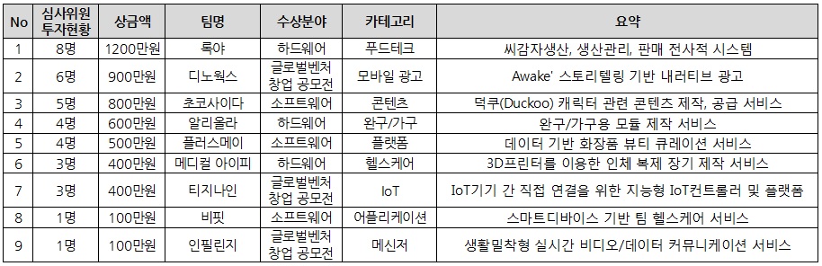 이번 최종 결선 데모데이의 수상은 총 5천만원의 상금을 10명의 심사위원이 1팀 최대 300만원 이내에서 투자하는 방식으로 진행되었다. 심사위원 8명에게 투자받은 록야가 가장 많은 금액인 1,200만원의 상금을 받았다.