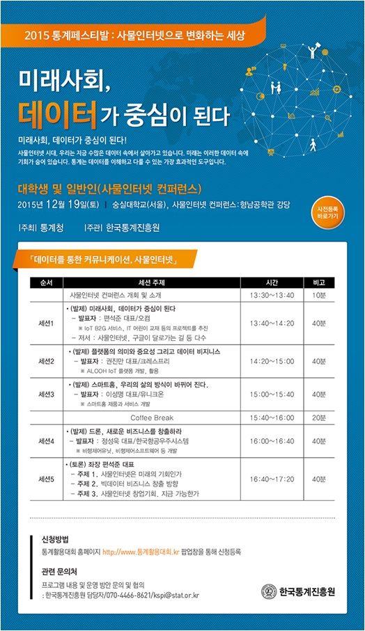 통계청이 주최하고 한국통계진흥원이 주관하는 ‘2015 통계페스티발 : 사물인터넷으로 변하는 세상’ 컨퍼런스가 12월 19일에 숭실대 형남공학관 강당에서 진행된다.