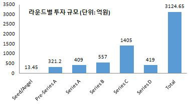 2015년 9월 중순 기준(2012이후)으로 해당 시점까지 상기 조건에 해당하는 스타트업 조사결과를 바탕으로 투자라운드 별 금액(누적) – 투자건수-전체 금액 비중을 분석한 결과 하기와 같이 분석되었다.