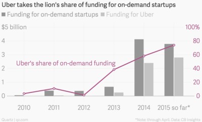 미국 또한 MOD 스타트업에 대한 투자가 해마다 상승하고 있다. QZ.com에서 조사한 내용을 보면 미국내 온디멘드 스타트업 펀딩규모는 2010년~2015년 5월 기준 누적으로 약 100억 달러에 달하는 것으로 나타났다. 그런데 주목할 만한 점은 Taxi On Demand 서비스인 Uber가 차지하는 비중이 2014~5년만 기준으로 보면 60% 이상을 차지하고 있는점. 얼마 전(2015년 12월 초)에는 72조 기업가치로 2조의 신규 자금조달에 성공했다고 발표한 것을 추가적으로 감안한다면, 2015년 미국 내 온디멘드 투자규모에서 Uber가 차지하는 비중은 압도적이라고 할 수 있다.