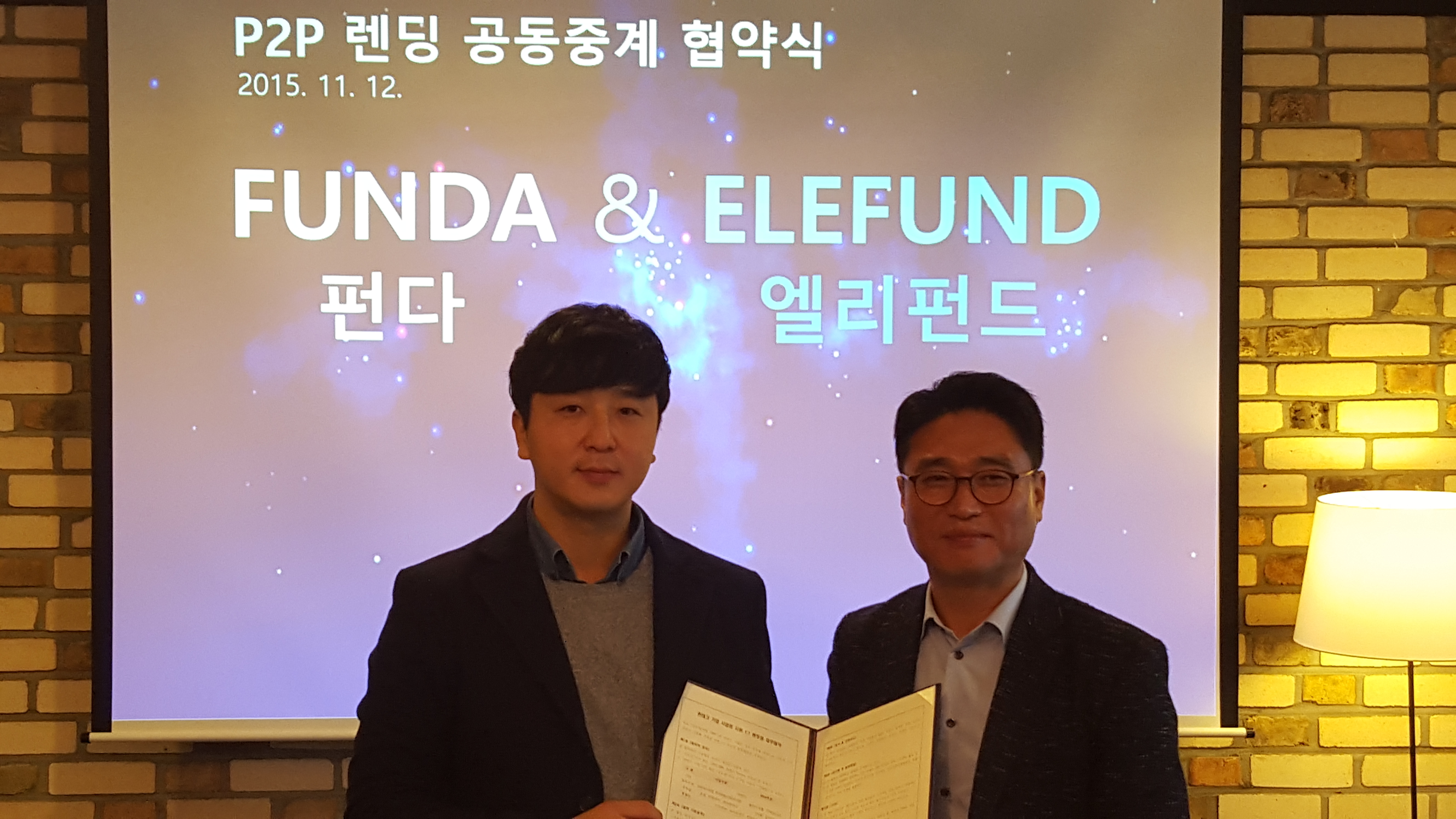 2015년 IBK 기업은행 핀테크 드림 공모전에서 각각 대상과 최우수상을 수상한 두 회사는 같은 해 11월 P2P금융상품 개발분야의 업무 협력과 공동 중개를 위한 협약(MOU)을 체결했다. 이후 양사는 P2P상품개발 분야에서의 시너지 강화를 위한 전략적 제휴를 단행하였으며 앞으로 엘리펀드의 부동산 담보 대출상품을 펀다 홈페이지에서 매주 공시할 예정이다.