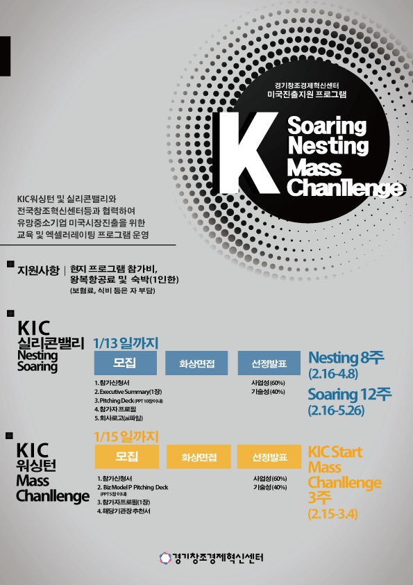 K-Global Nesting은 KIC SV(실리콘벨리)캠퍼스에서 기업가정신, 피칭, 네트워킹, 엔젤 투자자 연계 등 초기 스타트업의 현지화 지원을 받을 수 있는 1단계 인큐베이팅 프로그램이다. K-Global Soaring은 강소 스타트업을 위해 현지 엑셀러레이터와 연계, 멘토링·사업개발을 통한 레퍼런스 구축 등 지원하는 2단계 인큐베이팅 프로그램이다.