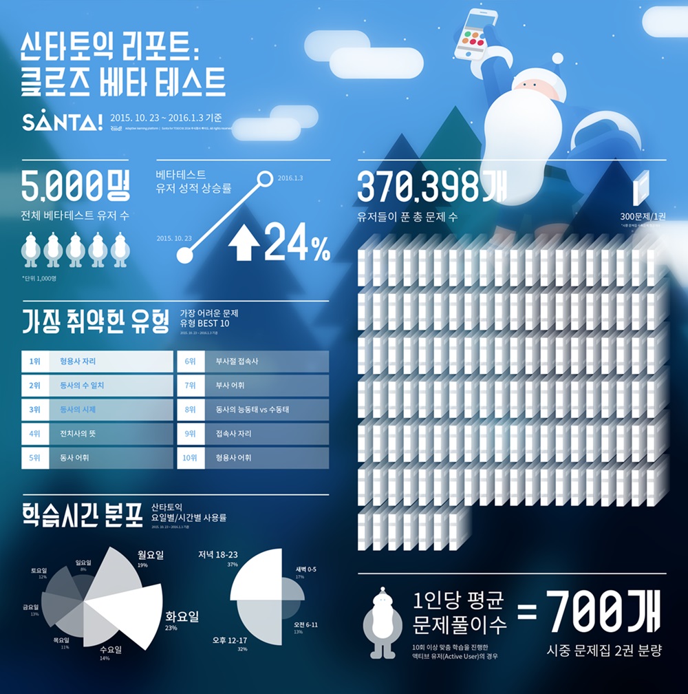 뤼이드(기술 기반 교육 스타트업)가 토익 일대일 학습 어플리케이션 ‘산타토익(Santa for TOEIC!) 클로즈 베타 테스트(CBT)결과를 공개했다.