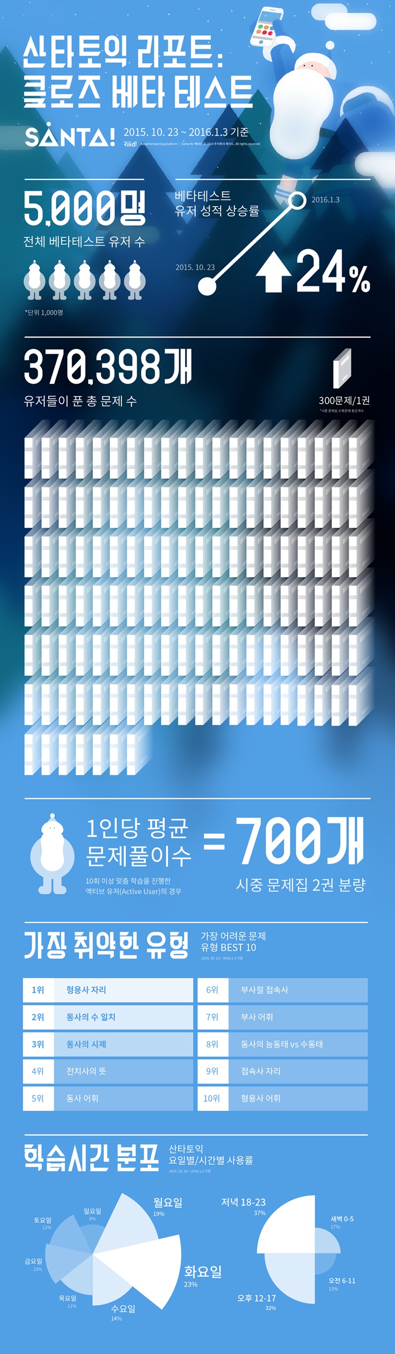일주일 중 산타토익 사용률이 가장 높은 날은 화요일(23%)과 월요일(19%)로 기록됐다. 상대적으로 일요일(8%) 학습량이 가장 적었다. 시간대별로는 저녁 6시에 가장 많은 사용자들이 산타토익을 이용했고, 저녁 6시에서 밤 12시 사이의 학습량이 가장 높았다.