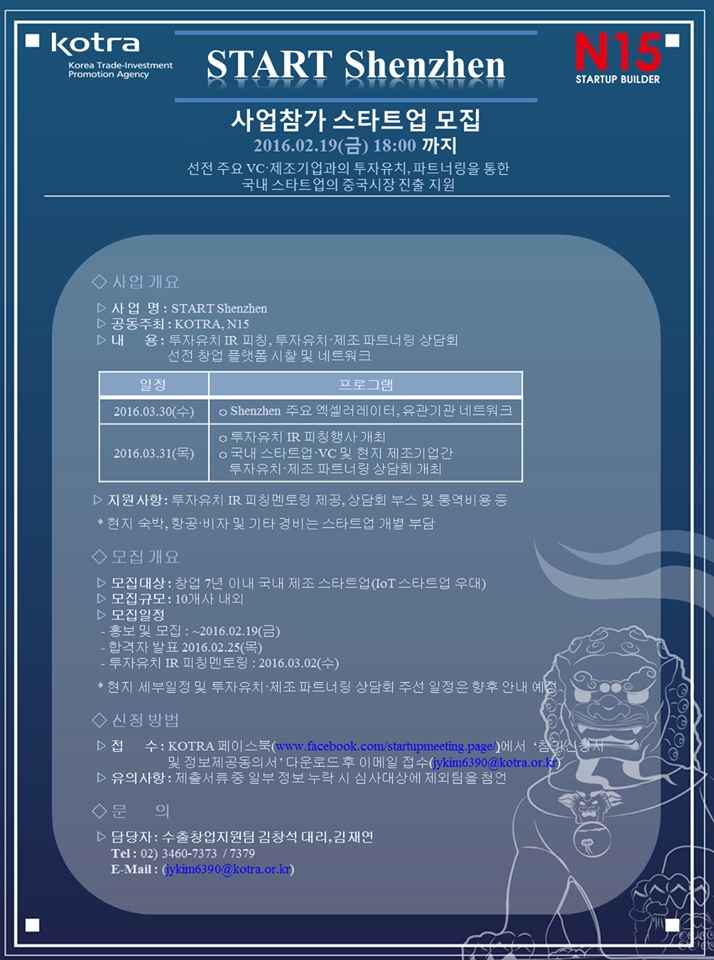 스타트업 해외진출지원사업을 코트라와 N15이 진행합니다. 본 행사는 중국 선전에서 진행되며, 아래의 공고문에 상세히 나와있습니다. 보다 자세한 사항은 코트라 수출창업지원팀 페이스북 페이지에서 확인할 수 있습니다.