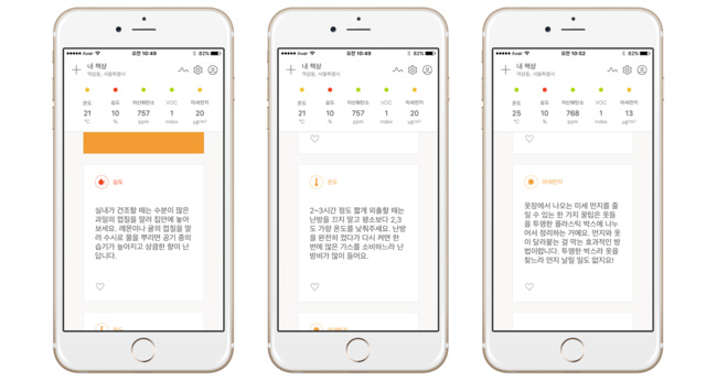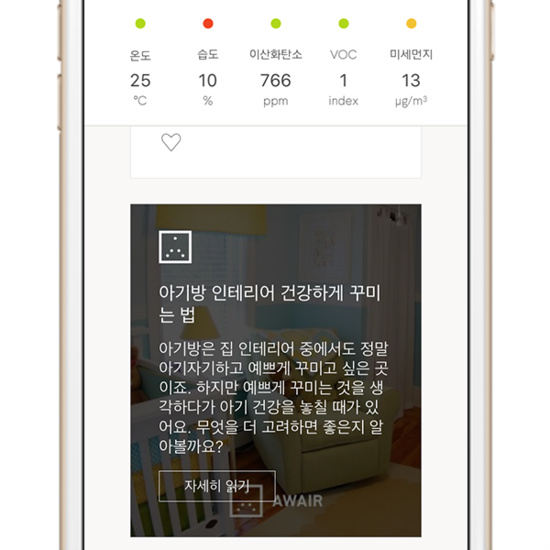맞춤형 공기 서비스 어웨어(Awair) 앱은 어웨어 기기와 연동하여 실내 곳곳의 공기질을 실시간으로 측정, 100점 만점의 어웨어 스코어로 집계해 보여 준다. 공기점수 집계를 위해 측정하는 항목은 온도, 습도, 이산화탄소, VOC(포름알데히드, 벤젠 등의 휘발성유기화합물), 미세먼지 등 총 5가지다. 어웨어 앱을 켜면 5가지 항목 각각의 점수를 그래프로 보여 주고 이를 바탕으로 실내 공기 점수를 측정해 보여준다.
