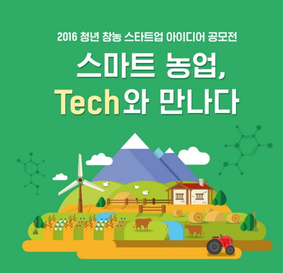 총 4회 진행되는 2016년 청년 창농 스타트업 아이디어 공모전의 1차 주제는 ‘스마트 농업, Tech와 만나다’로 ICT 융ㆍ복합 기술 아이디어 분야, 농업시설・장치(소도구포함) 개선 아이디어 분야, 에너지 효율화 아이디어 분야의 아이디어를 공모한다. 상기 표기분야 외에도 농업분야에 Tech가 접목될 수 있는 아이디어는 인정된다.