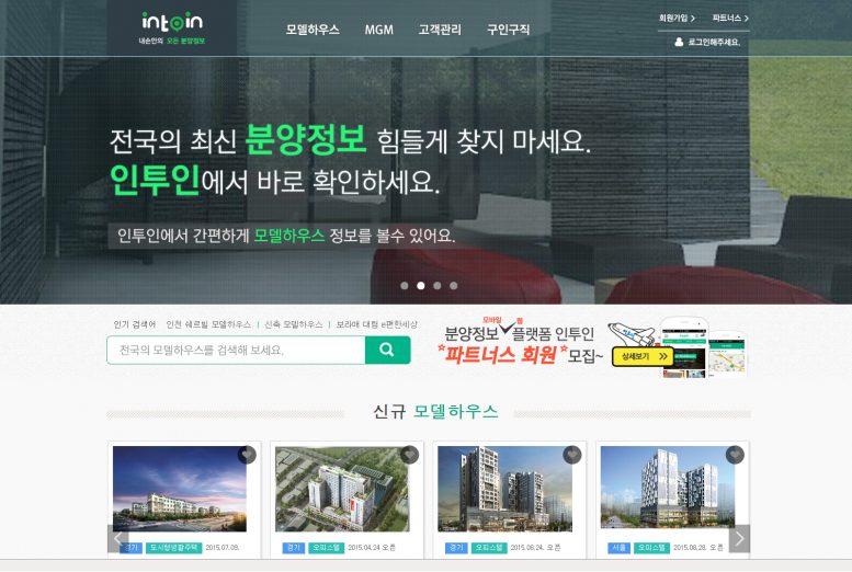 인투인네트웍스가 서비스하고 있는 부동산 분양 정보 O2O 서비스 ‘인투인’이 웹 서비스를 정식 출시했다고 밝혔다. ‘인투인’은 전국 모델하우스 정보 뿐 만 아니라, 온라인 분양 중계 서비스(Online MGM)와 현장별 고객관리 기능 등을 갖추고 있으며, 현재 분양 대행 회사들과 분양 관련 업자들을 대상으로 한 ‘파트너스’ 회원 모집에 200여 업체가 사전 등록하는 등 부동산 분양 업계 내에서 화제를 모으고 있다.