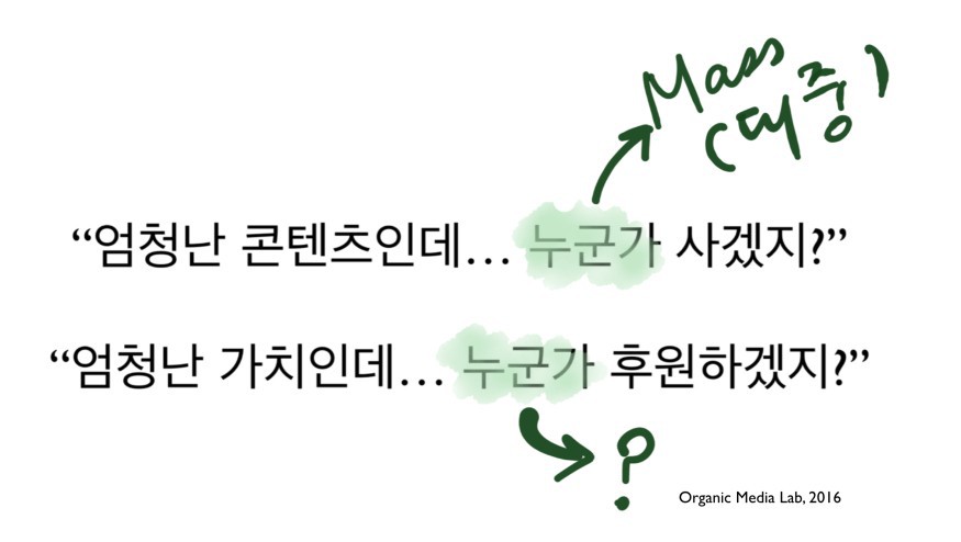 내 책에서 나는 ‘대중은 사라졌다‘, 대중이 없으므로 더 이상 ‘대중 매체’라는 존재는 없다고 단언했다. 그러나 막상 내 책을 낼 때는 맨 먼저 ‘누군가 사겠지?’, 우리가 엄청난 가치를 생산할 텐데 ‘누군가 후원하겠지?’ 이런 생각이 스쳤다. 시장이 살아있는 생명체이며 우리의 제품이 모두 살아있는 유기체라고 써놓고 몸으로는 또 똑같은 실수를 반복할뻔한 아찔한 순간이다.