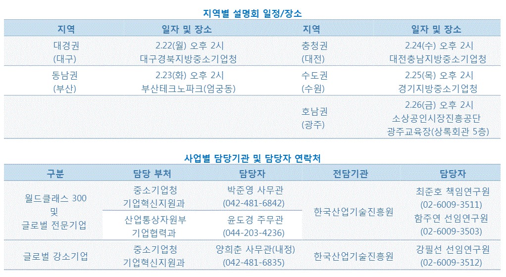 이와 관련, 중기청과 산업부는 사업 참여를 희망하는 중소‧중견기업들의 이해를 돕기 위해 지역 거점별 설명회를 개최합니다.자세한 사항은 산업부 홈페이지(www.motie.go.kr) 및 중기청 홈페이지(www.smba.go.kr) ‘한국형 히든챔피언 육성사업 통합 공고문’에서 확인하세요.^^