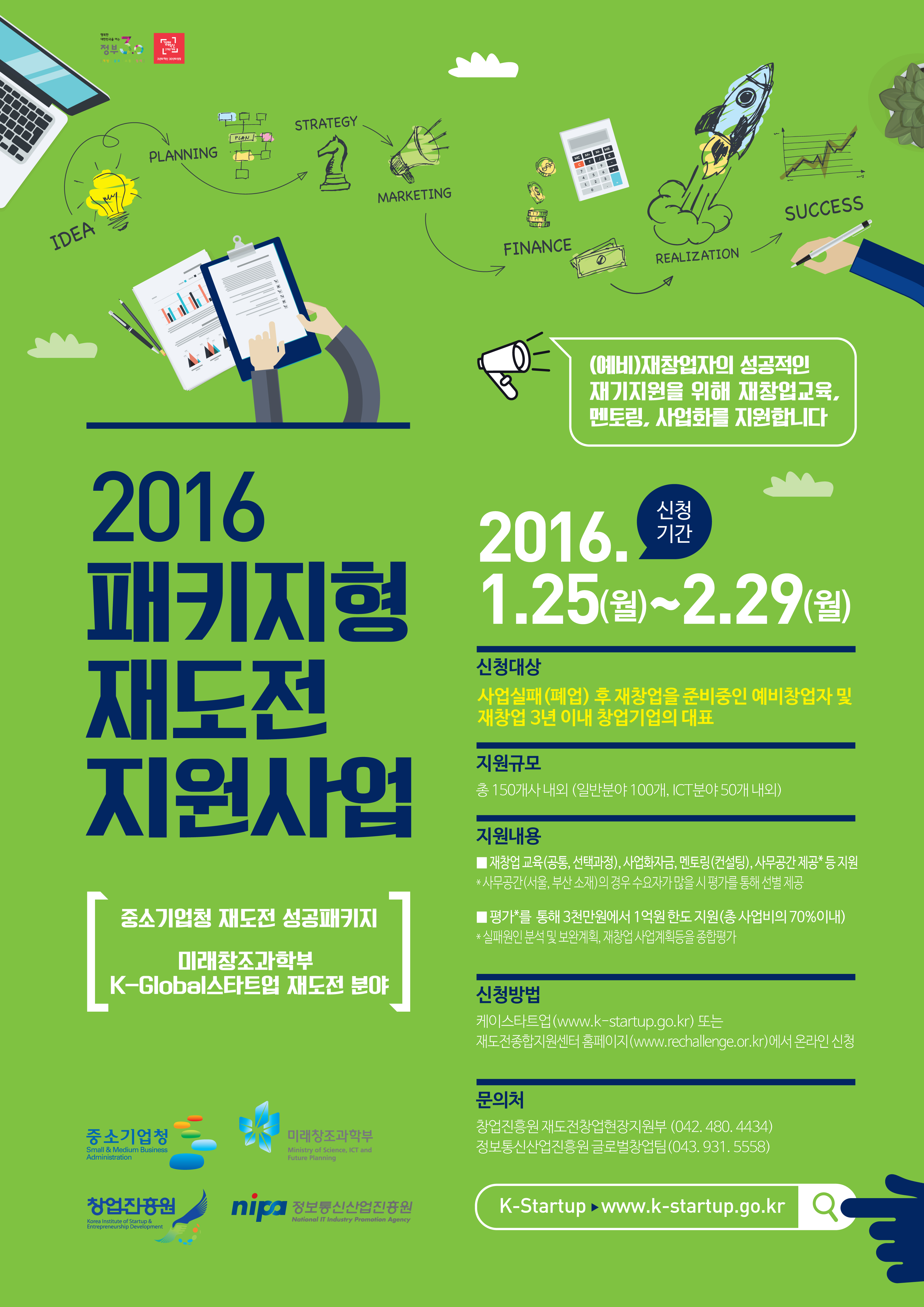 중소기업청은 미래창조과학부, 금융위원회, 부산광역시등 관련부처와 합동으로 2016년 재도전 지원사업을 통합 공고 하였다. 경영하다 실패한 중소기업의 경우 이번 재도전 지원사업을 통해 재기가 보다 용이해질 전망이다.