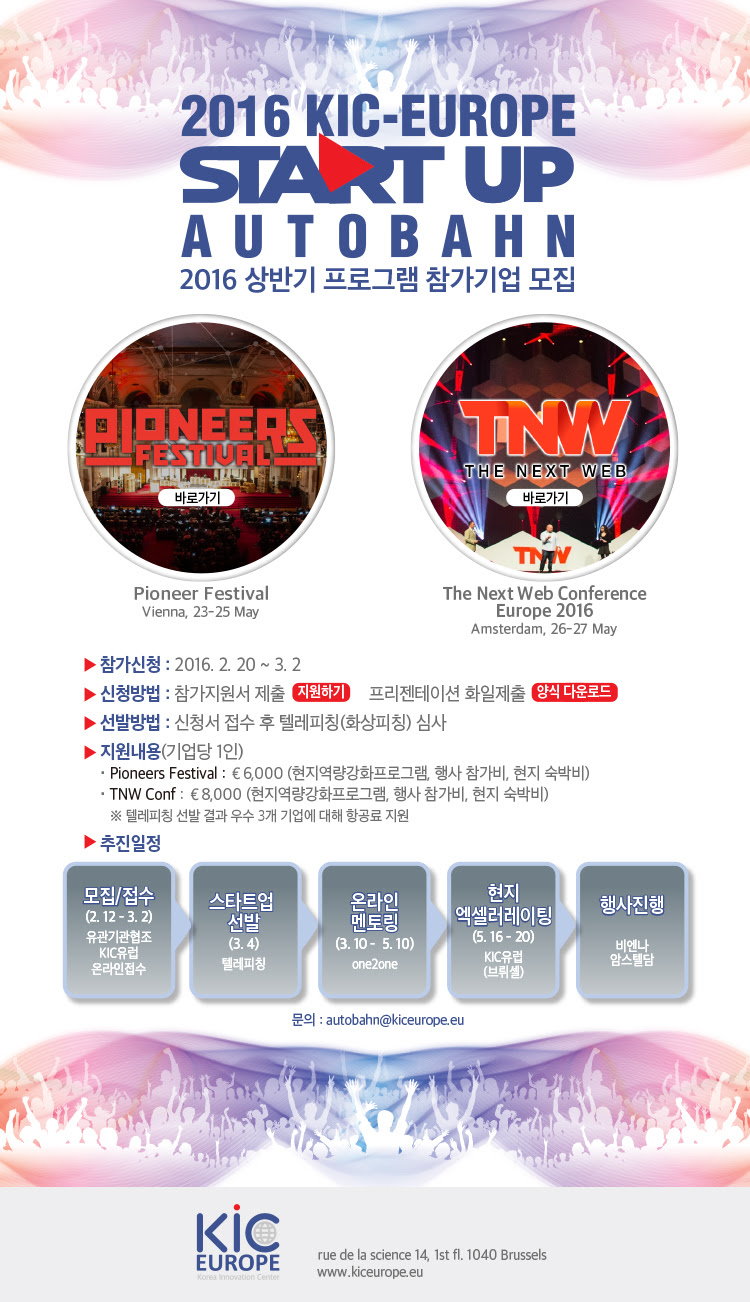 한-유럽연합 연구혁신센터(KIC-Europe)가 2016 상반기 엑셀러레이터 프로그램 참가기업을 모집한다. 이번 액셀러레이터 프로그램에 신청하여 선발된 인원은 ‘파이오니어 페스티벌‘과 ‘2016 더넥스트웹 유럽 컨퍼런스‘에 각각 참가하게 된다.