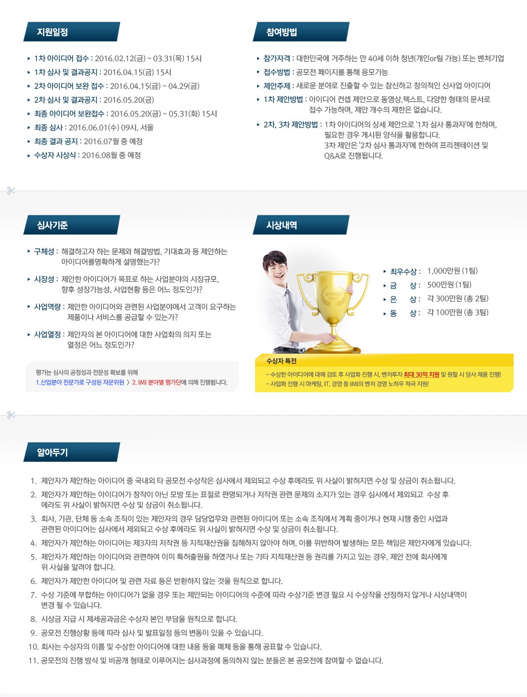 특히, 사업 타당성이 검증된 수상작이 사업화될 경우, 최대 30억 원 규모의 투자 지원금과 아이엠아이의 경영 노하우가 제공된다. 또 수상자가 원할 시 아이엠아이 채용 기회도 부여될 예정이다.