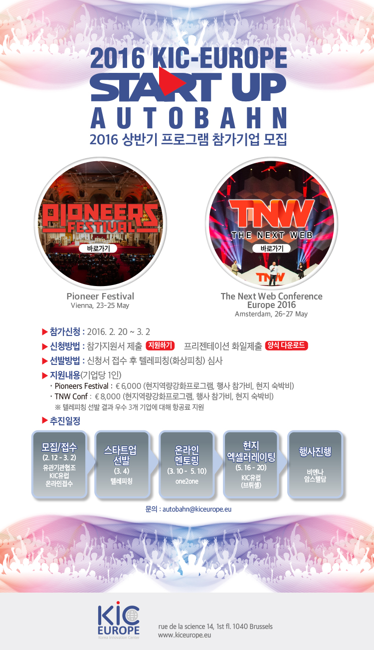 KIC 유럽이 ‘2016 스타트업 아우토반’ 상반기 프로그램 참가 기업을 모집한다. 참여신청은 ‘파이어니어즈 패스티벌’과 ‘더 넥스트 웹 컨퍼런스 유럽 2016’ 부문으로 나뉘며 2월 20일부터 3월 2일까지 접수받는다.