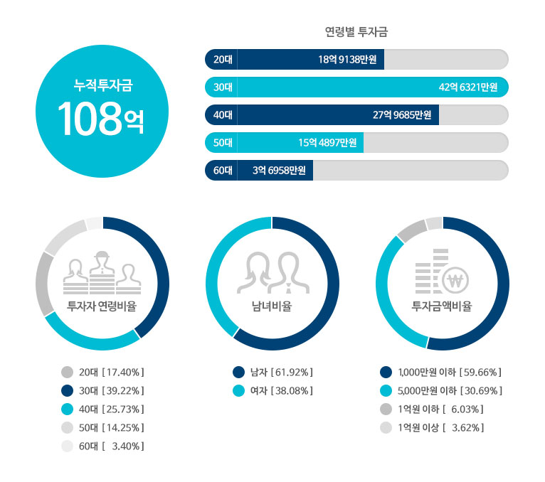 테라펀딩의 투자자 데이터 분석 결과 30대의 누적 투자액이 42억 6천만원으로 가장 높았으며, 평균 투자액이 가장 높은 연령대는 50대였다. 특히 60대 이상 투자자의 평균 투자금액이 두 번째로 높아 은퇴 시기 노후자금의 적당한 투자처를 찾지 못한 노년층의 투자가 두드러졌다. 1억 원 이상 고액투자자 비율이 3.62%를 차지해 고액 자산가들도 P2P대출 상품에 대한 관심도가 높은 것으로 분석됐다.
