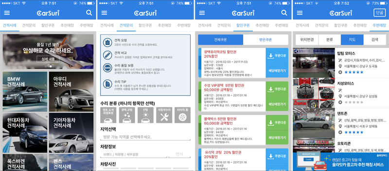 작년 1월에 출시한 카수리는 9만 다운로드 수를 기록하였고, 총 견적 문의는 2만 건에 육박하고 있다. 견적 문의를 올린 사용자 중 20%가 실제 제휴매장의 수리 서비스까지 이어지고 있다.